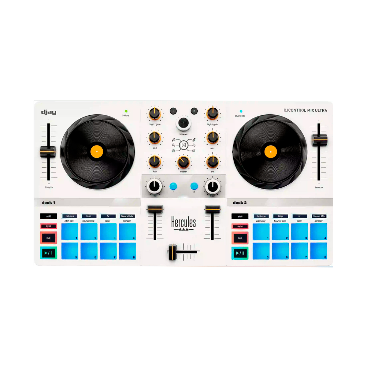 La DJControl Mix Ultra cuenta con 2 decks virtuales, con controles de pitch, volumen y mezcla en el centro. Además de 8 pads para actuación, ofrece jog wheels sensibles al tacto que te permiten hacer scratching con precisión. El diseño intuitivo proporciona todos los controles esenciales que necesitas para crear mezclas de nivel profesional, sin importar dónde estés.